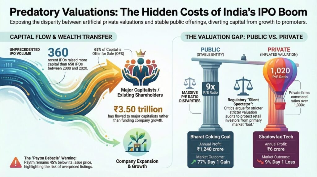 - Valuation Contrast: The reasonable pricing of PSU firm Bharat Coking Coal (PE 9) stands in stark contrast to private firms like Shadowfax (PE 1,020).
