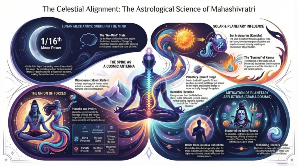 - The Importance of Vigilance: This is why the tradition of Jagran (staying awake and keeping the spine vertical) is so vital. If one lies down, they miss this natural celestial “elevator” that pushes energy upward.
